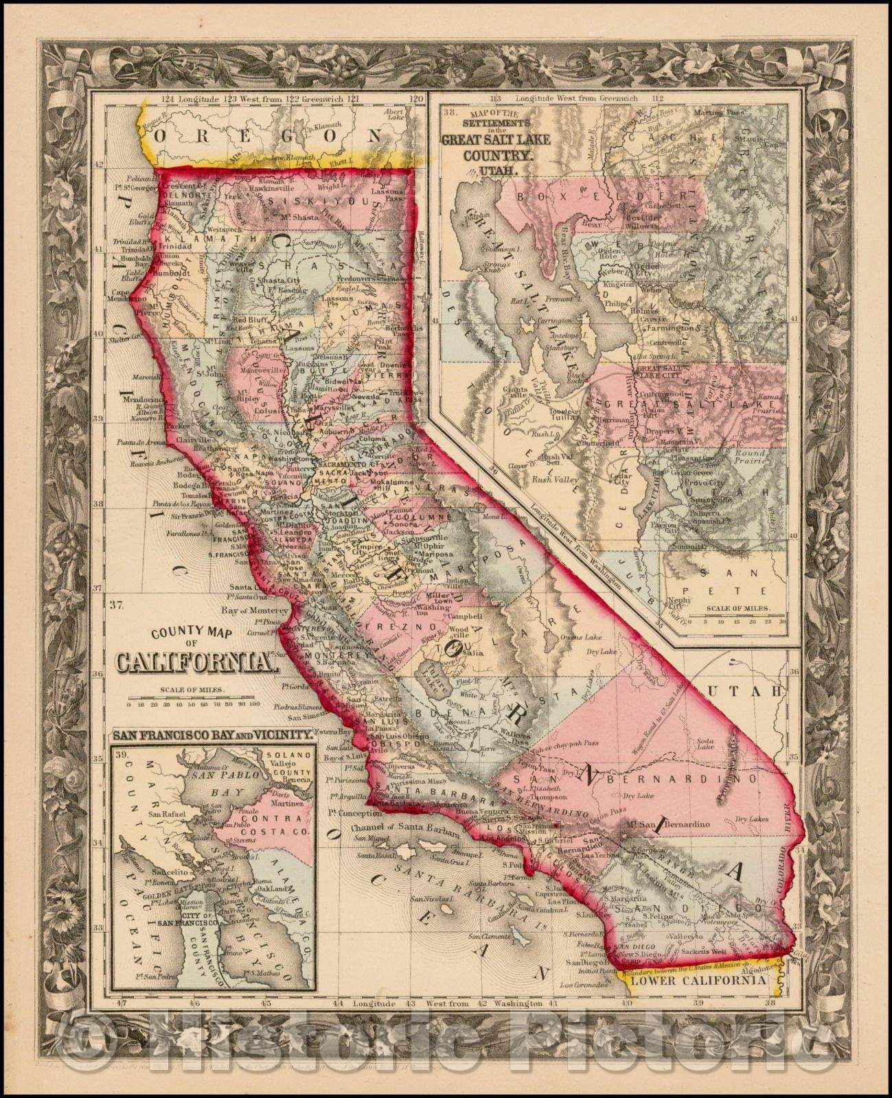 County Map of California (with large inset of Great Salt Lake Country), 1860, Samuel Augustus Mitchell Jr.