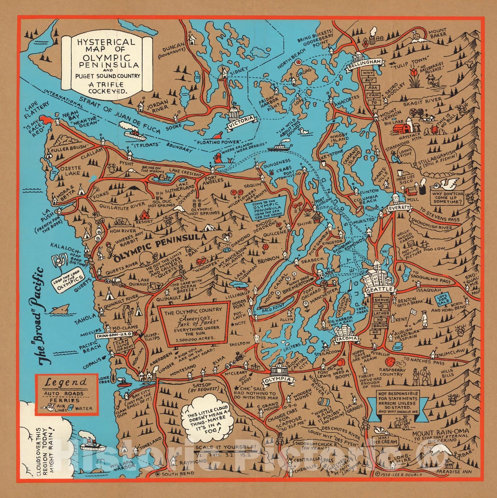 • .Historic Map - Hysterical Map of Olympic Peninsula and Puget Sound Country, a Trifle Cockeyed, 1934 - Vintage Wall Art
