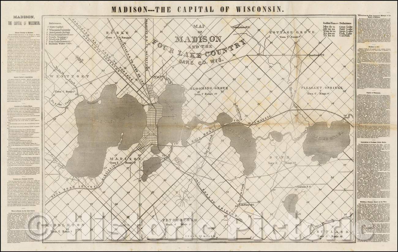 • .Historic Map - Map of Madison and the Four Lake Country Dane Co. Wis, 1854, Anonymous - Vintage Wall Art