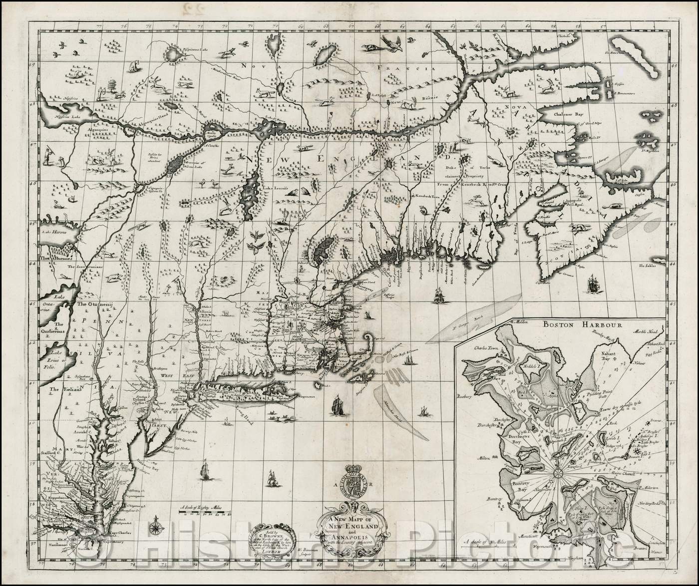 • Historic Map - A New Mapp of New England and Annapolis with the Country's adjacent, 1712, Christopher Browne - Vintage Wall Art