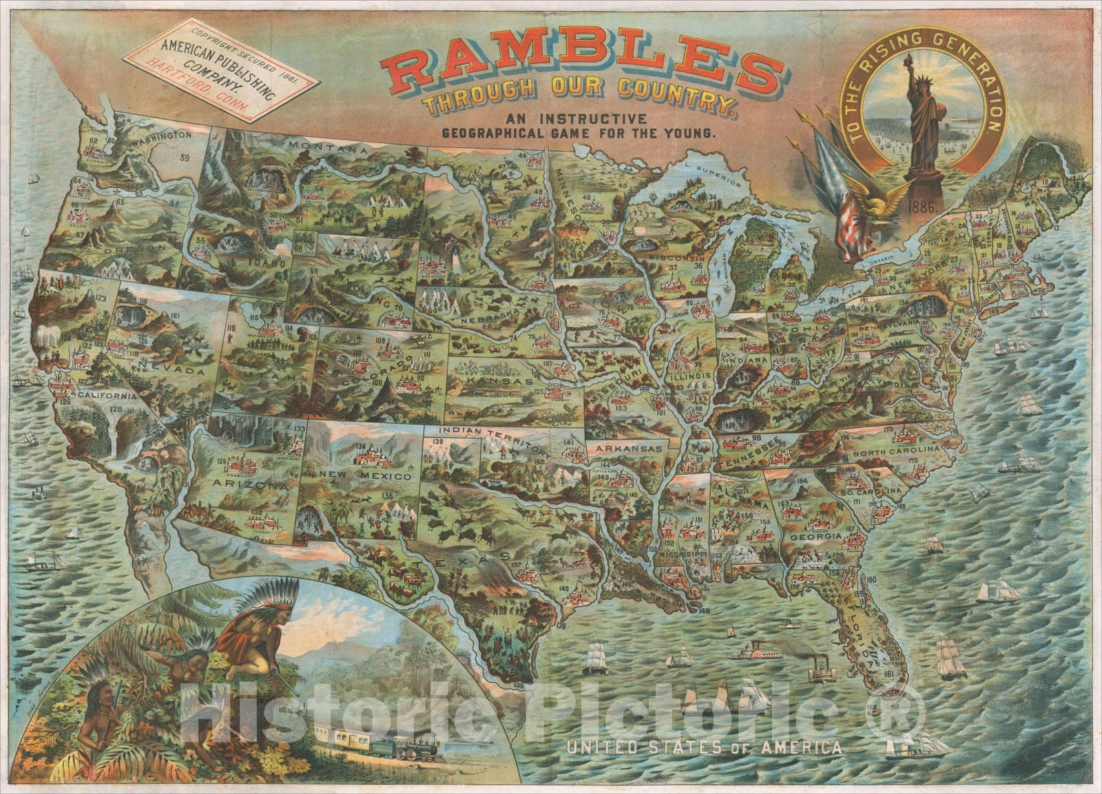 Historic Map : Rambles Through Our Country. An Instructive Geographical Game For The Young, 1886, 1881, American Publishing Co., Vintage Wall Art