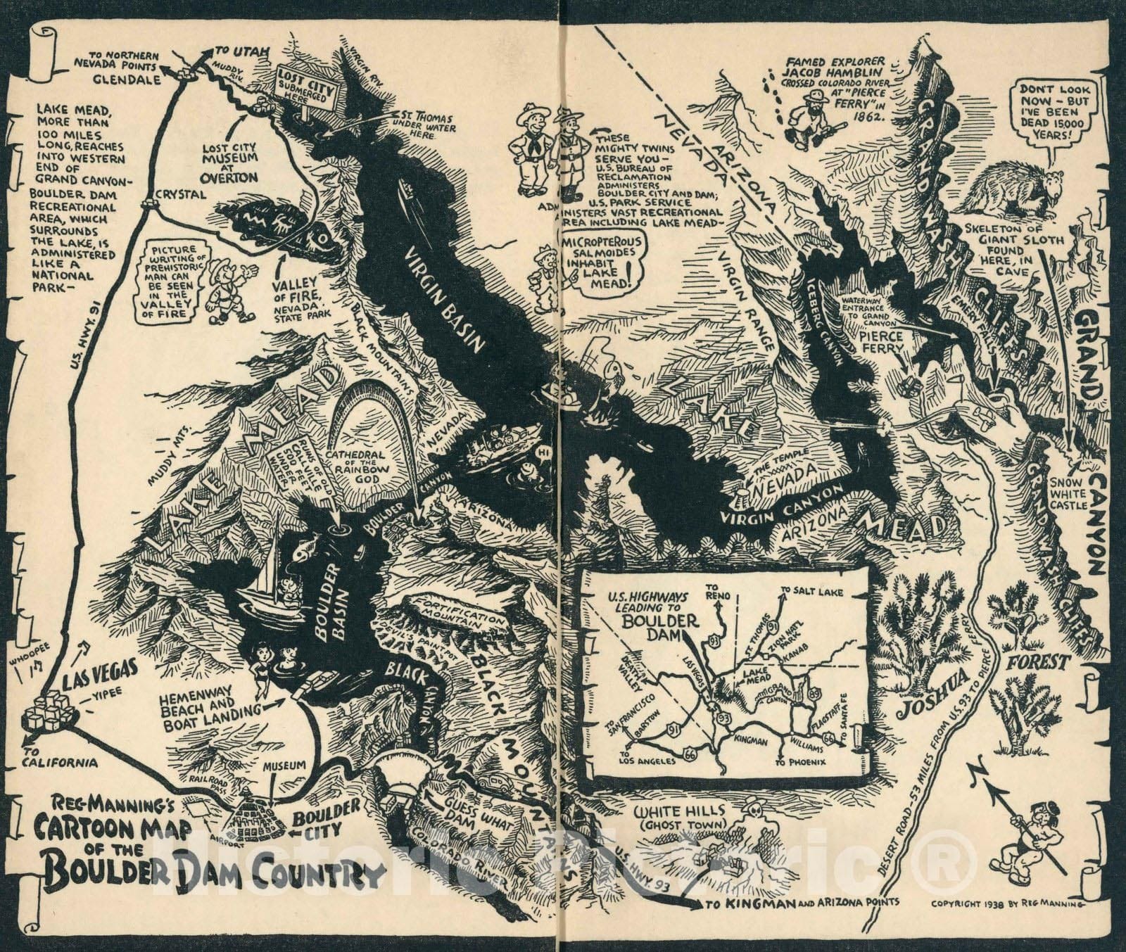 • .Historic Map : Reg Manning's Cartoon Map of Boulder Dam Country, 1938 - Vintage Wall Art