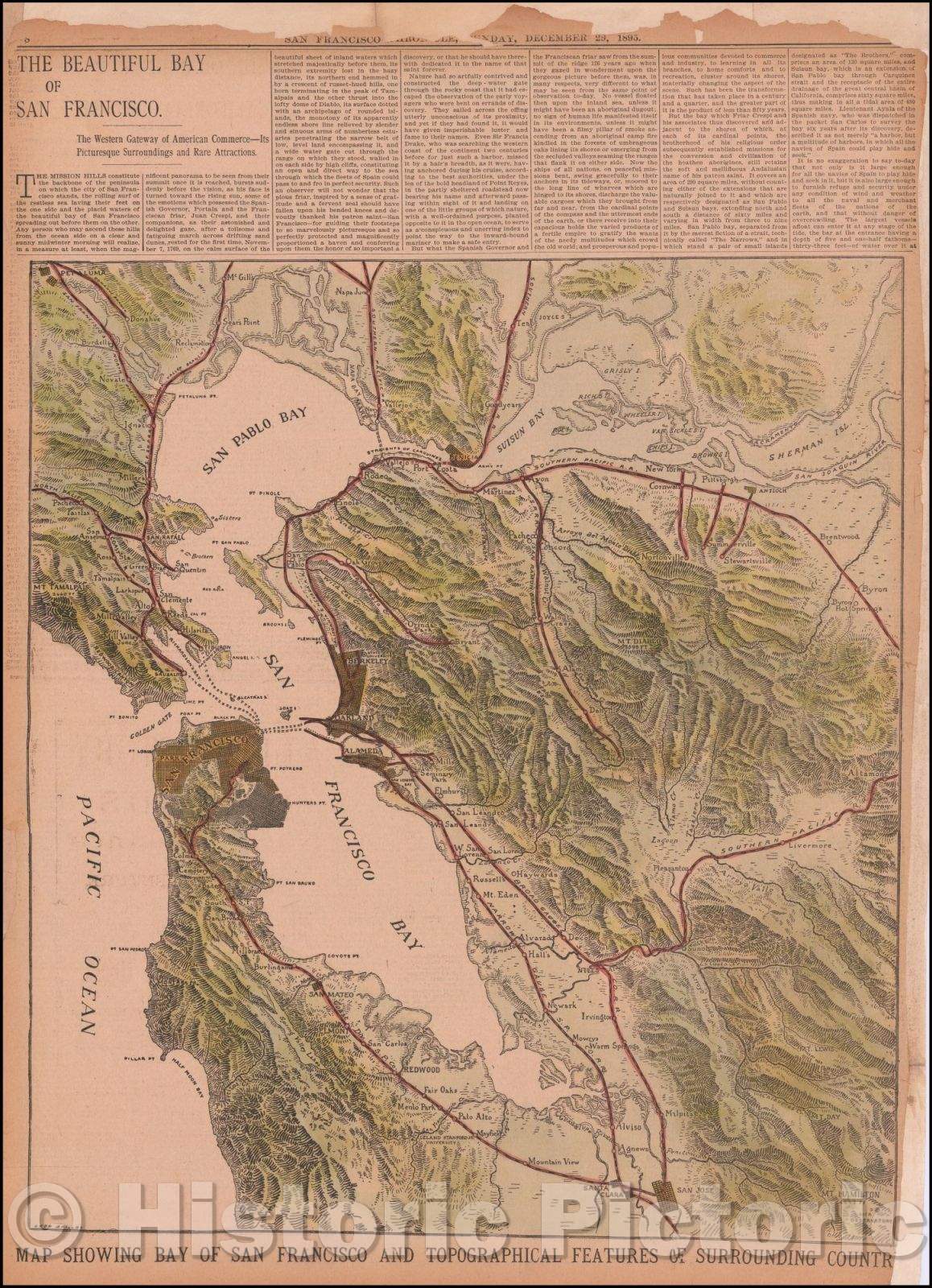 Historic Map - Map Showing Bay of San Francisco and Topographical Features of Surrounding Country, 1893, Leon Boillot - Vintage Wall Art