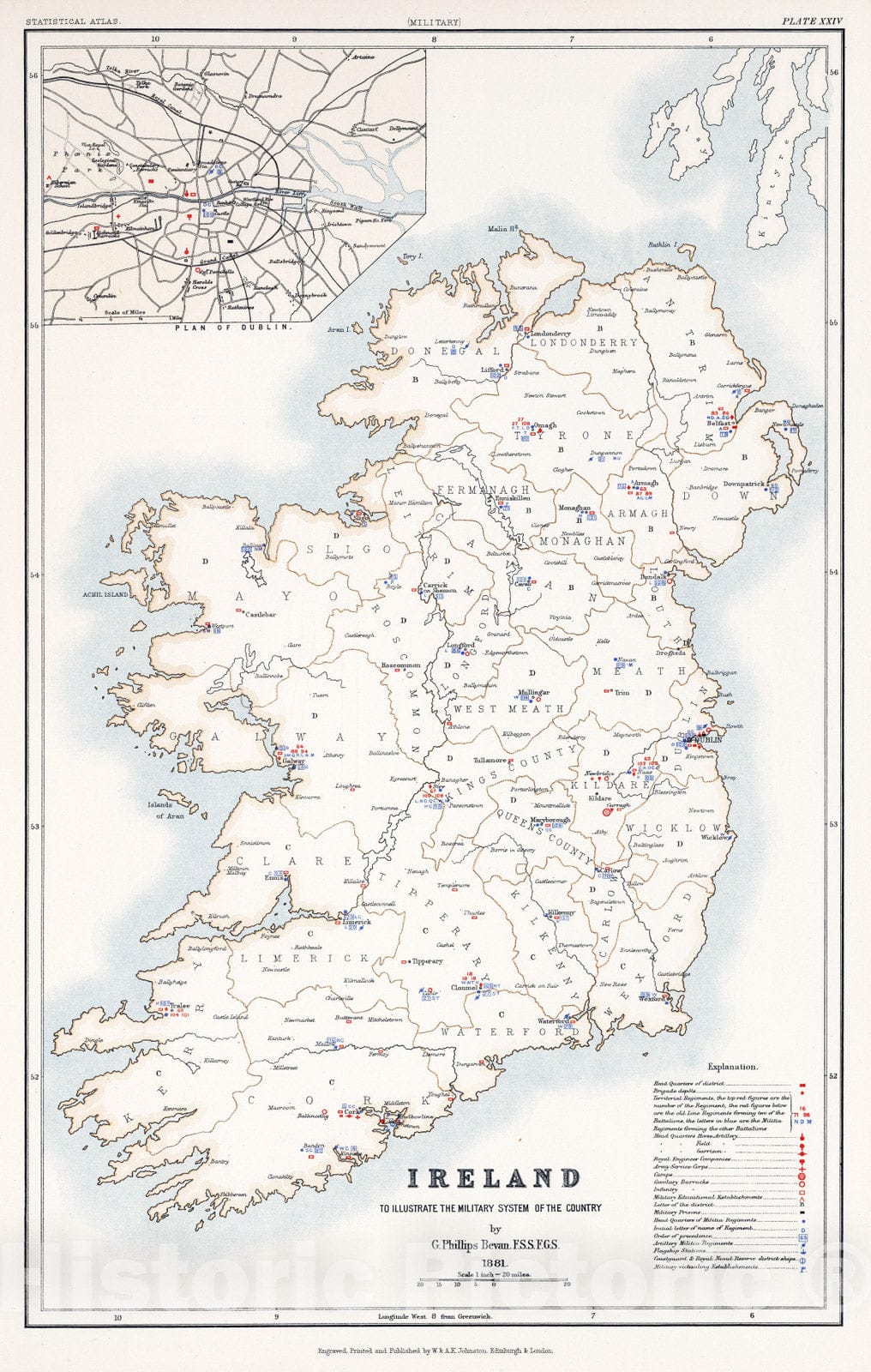 • .Historic Map : Statistical Atlas - 1881 Ireland to Illustrate the Military Condition of the Country. - Vintage Wall Art