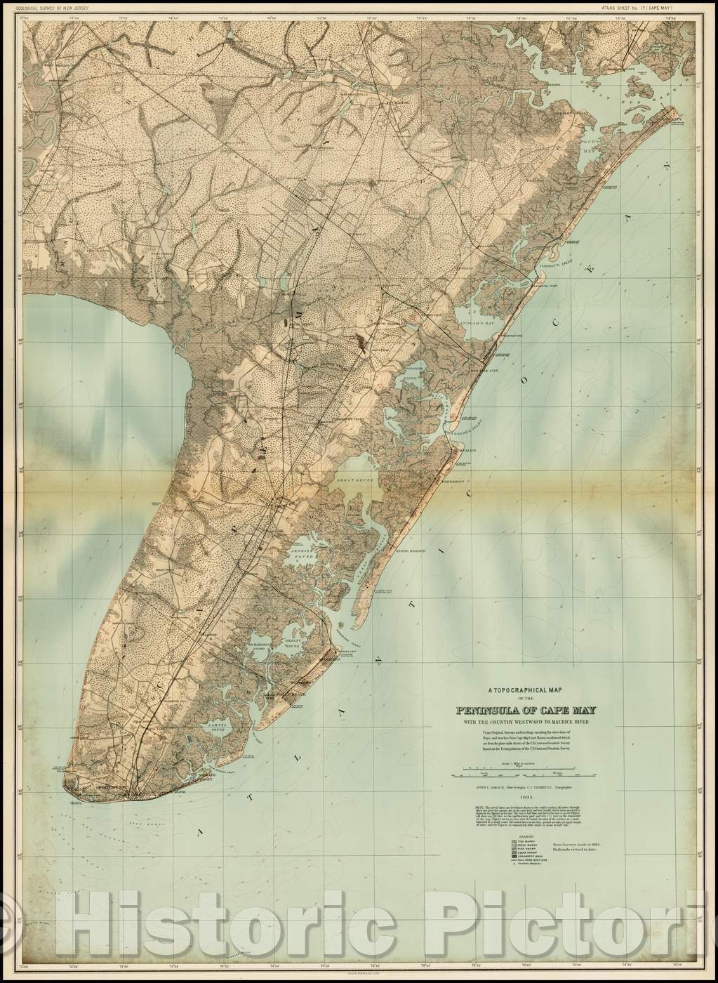 • .Historic Map - A Topographical Map of the Peninsula of Cape Map with The Country Westward to Maurice River, 1896, Geological Survey of New Jersey - Vintage Wall Art