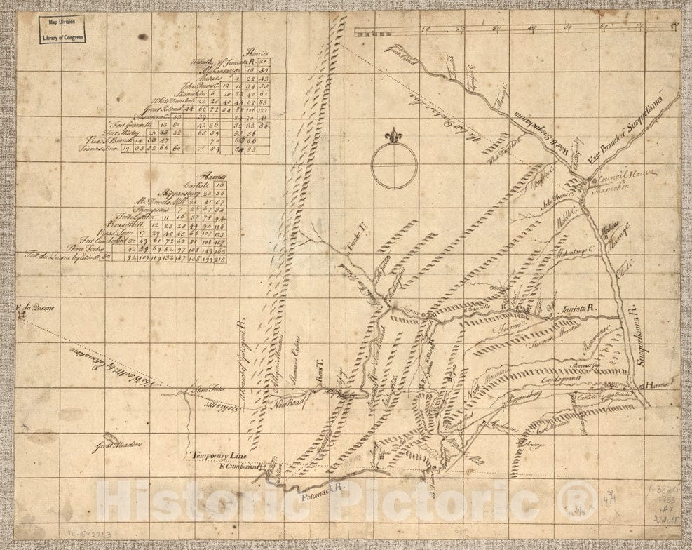 Historical Map, 1755 Mr. Armstrong's rough draft of the country to the west of Susquehanna, Vintage Wall Art