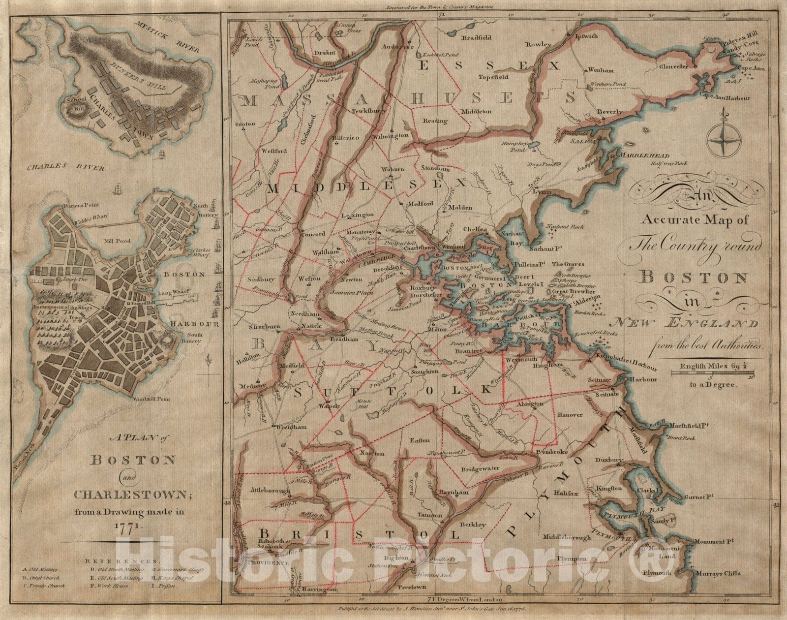 Historical Map, 1776 an Accurate map of The Country Round Boston in New England from The Best Authorities, Vintage Wall Art