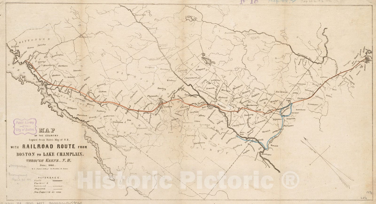 Historical Map, 1845 Map of The Country copied from Hale's map of N. E. with Railroad Route from Boston to Lake Champlain : Through Keene, N. H, Vintage Wall Art