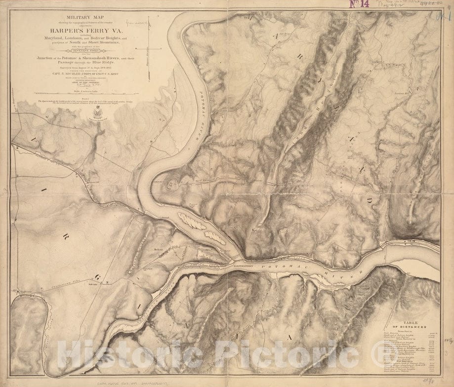 Historical Map, 1863 Military map showing the topographical features of the country adjacent to Harper's Ferry, Va : including Maryland, Loudoun, Vintage Wall Art