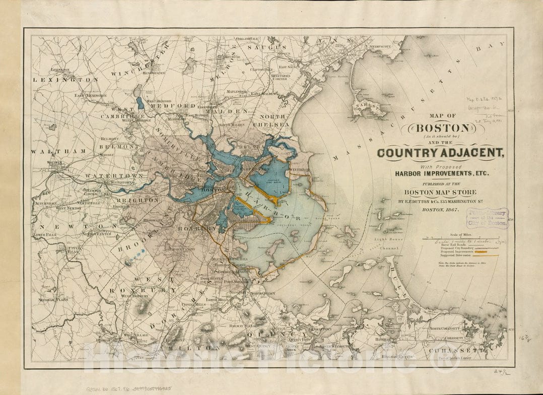 Historical Map, 1867 Map of Boston (as it Should be) and The Country Adjacent, with Proposed Harbor improvements, etc, Vintage Wall Art