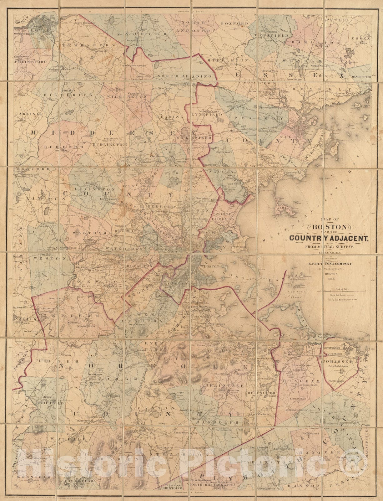 Historical Map, 1868 Map of Boston and The Country Adjacent, from Actual surveys, Vintage Wall Art