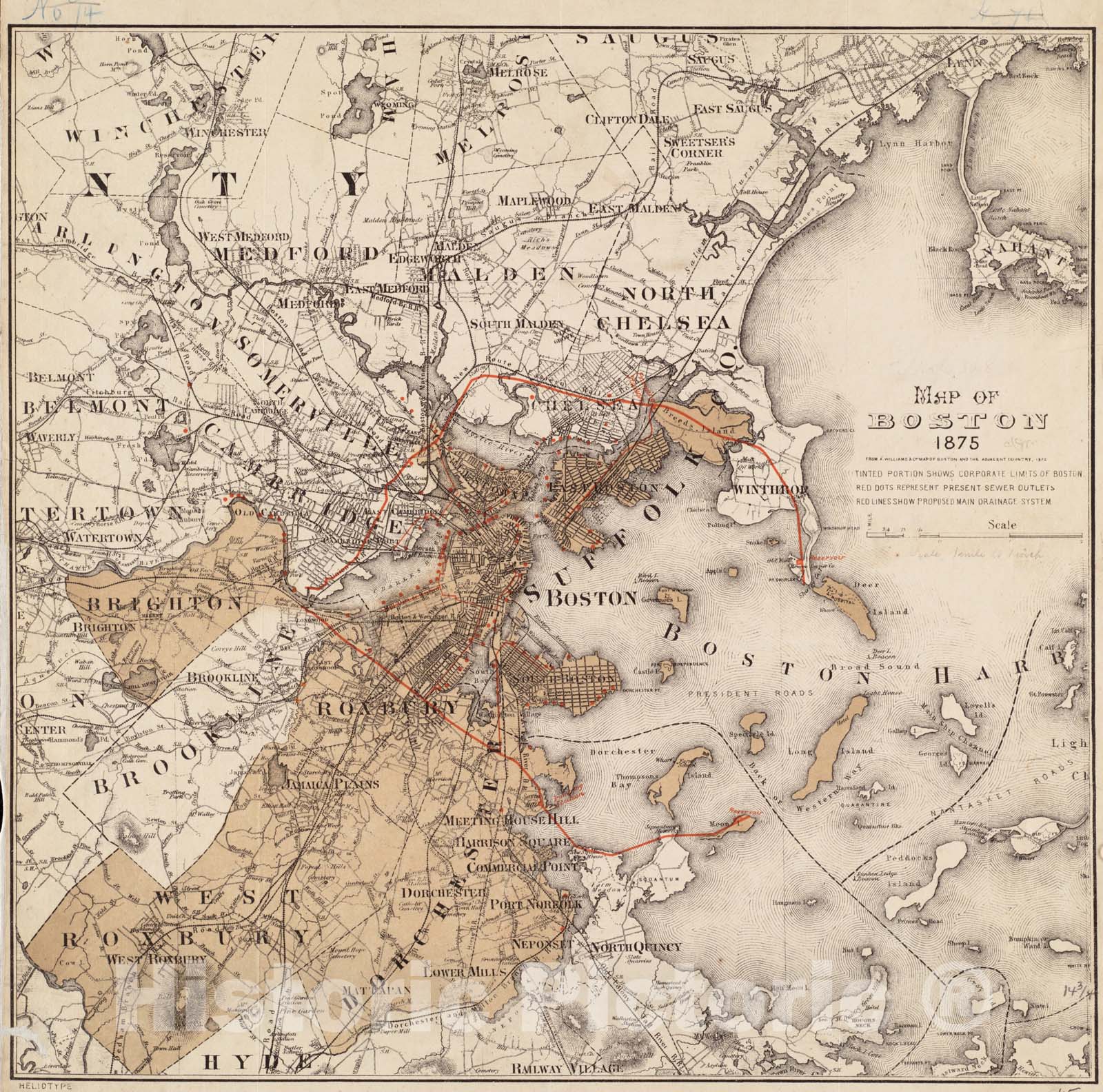 Historical Map, Map of Boston 1875 : from A. Williams & Cos. map of Boston and The Adjacent Country, 1872, Vintage Wall Art