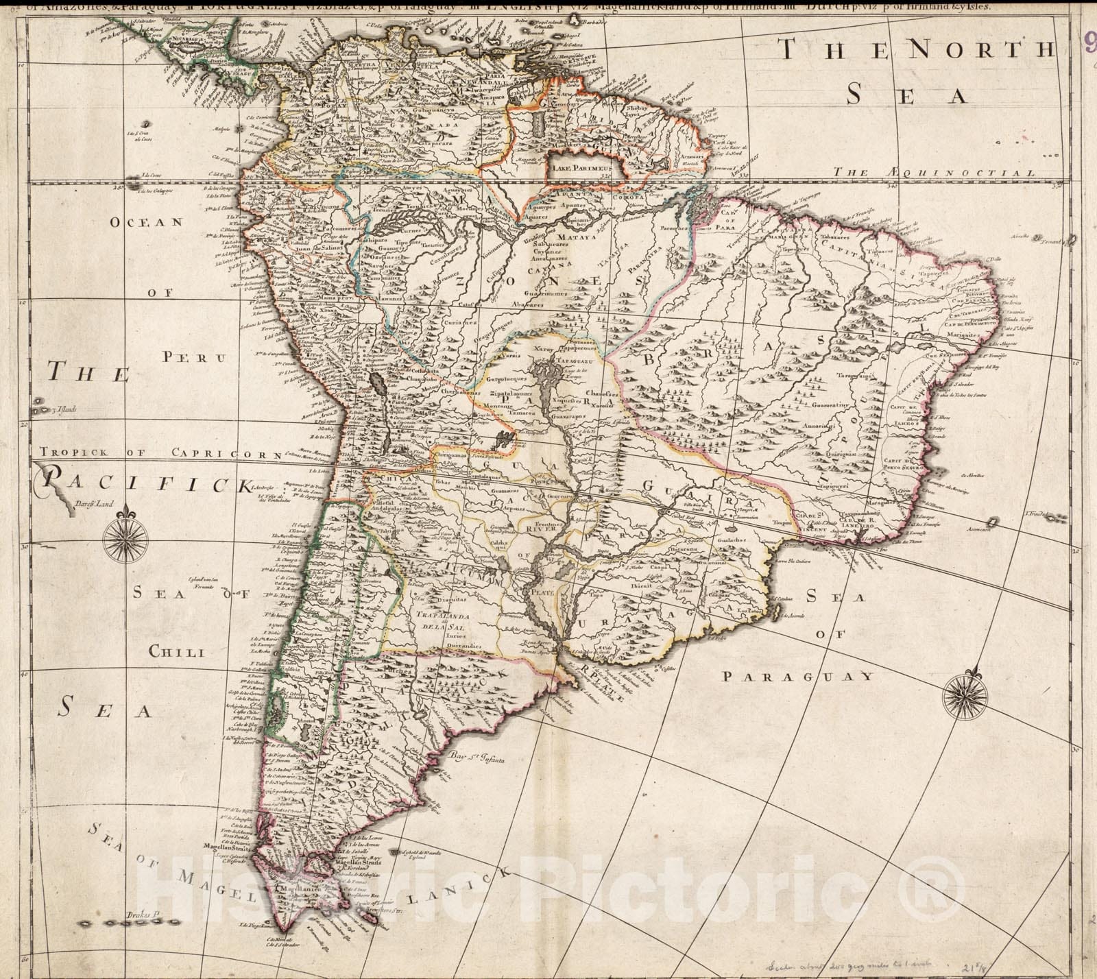 Historical Map, c.1684 South America Divided into its IIII principall Parts : I Spanish Part: vizt. Firmland, Guiana, Peru, Chili, pt of The Country of Amazones, Paraguay: Reprint
