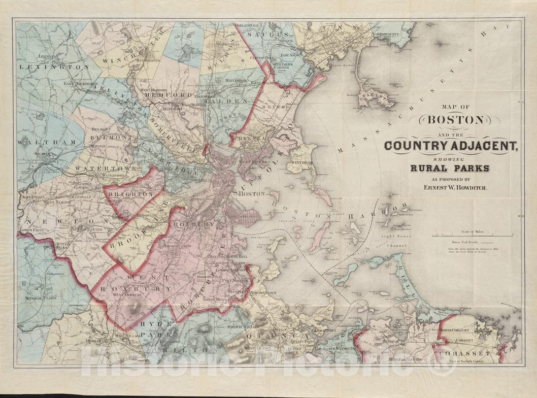 • Historical Map, ca. 1874 Map of Boston and the country adjacent, showing rural parks, Vintage Wall Art
