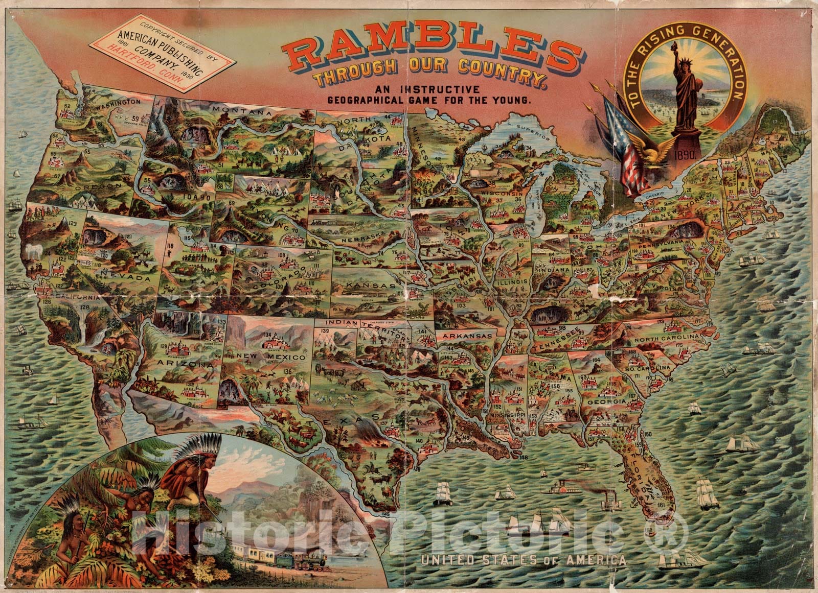 Historical Map, ca. 1890 Rambles through our country : an instructive geographical game for the young, Vintage Wall Art