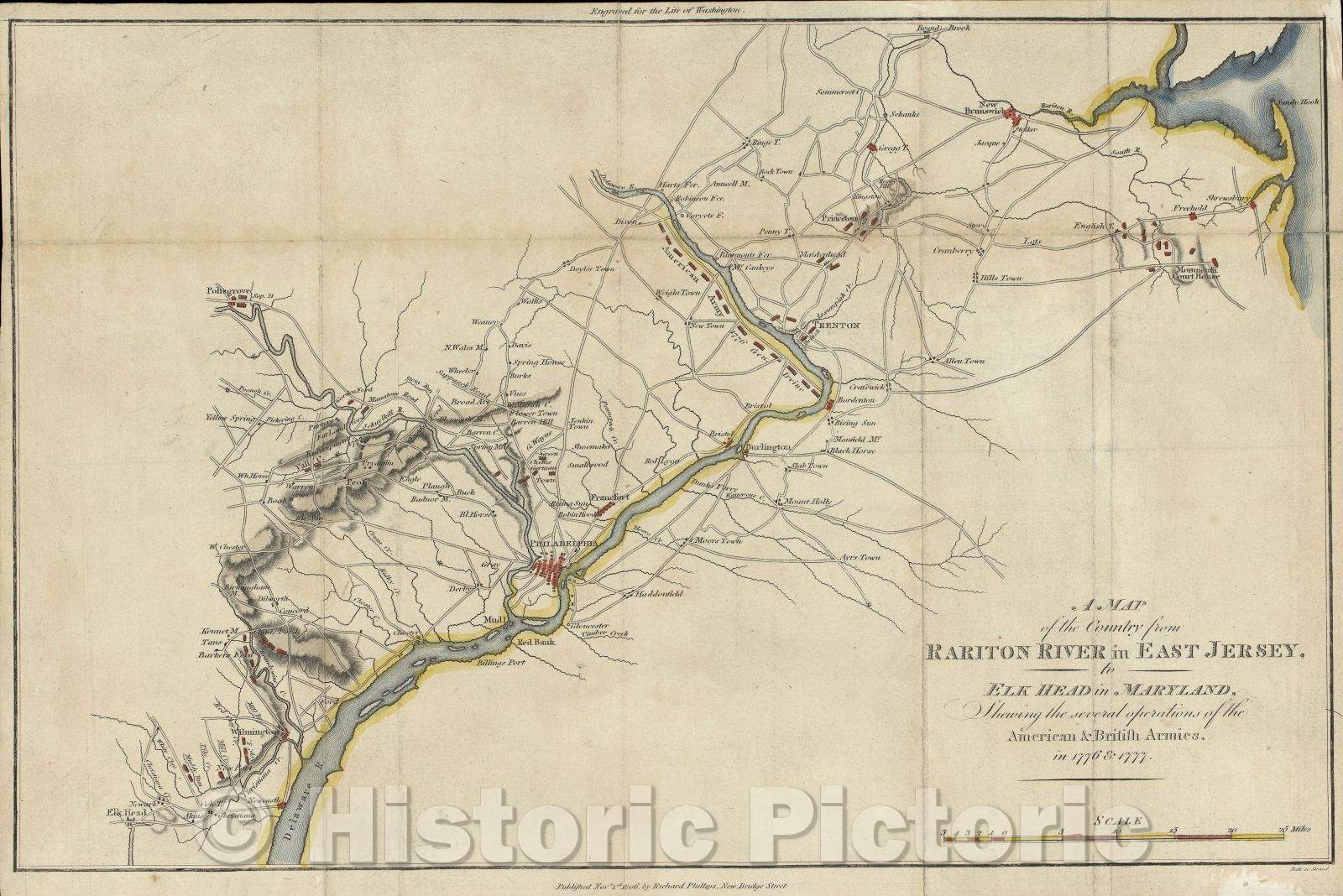 • .Historic Map : A Map of the Country from Rariton River in East Jersey, to Elk Head in Maryland, Shewing the several operations of the American and British Armies, 1806 , Vintage Wall Art