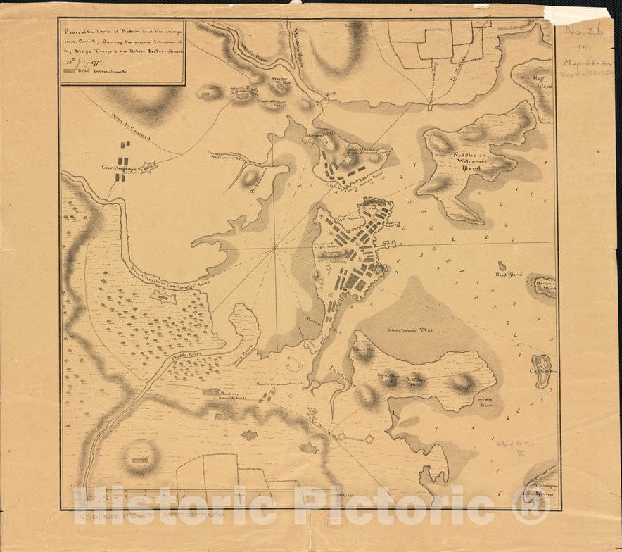 Historical Map, Plan of The Town of Boston and circumjacent Country shewing The Present Situation of The Kings Troops & The Rebels Intrenchments 25th July 1775, Vintage Wall Art