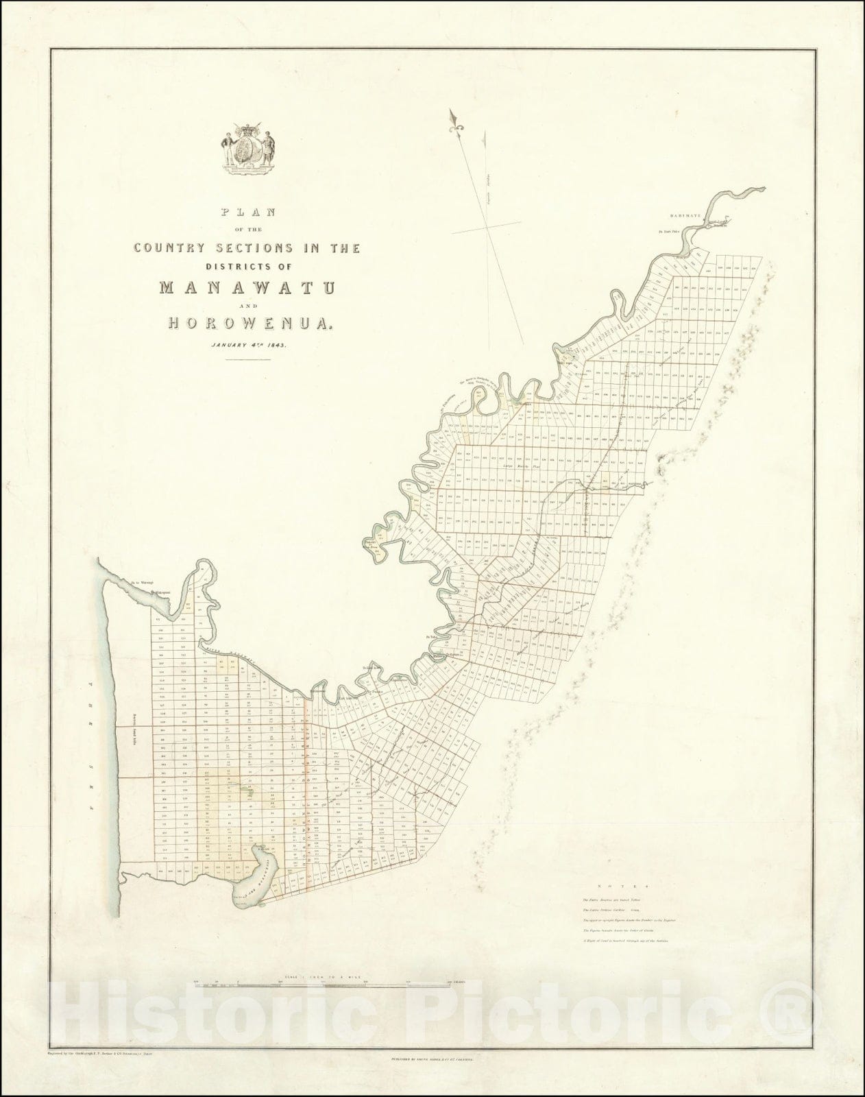Historic Map : Plan of the Country Sections in the Districts of Manawatu and Horowenua.January 4th, 1843., 1843, Vintage Wall Art