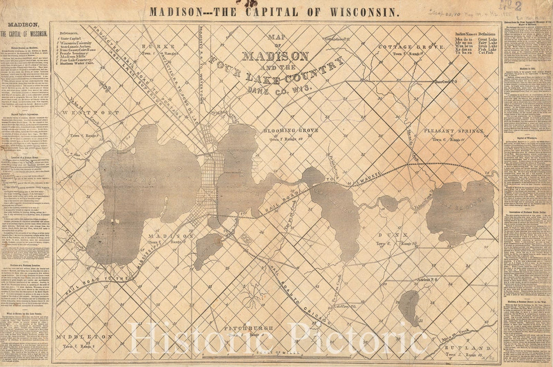 Historical Map, 1855 Map of Madison and The Four Lake Country, Dane Co. WIS, Vintage Wall Art