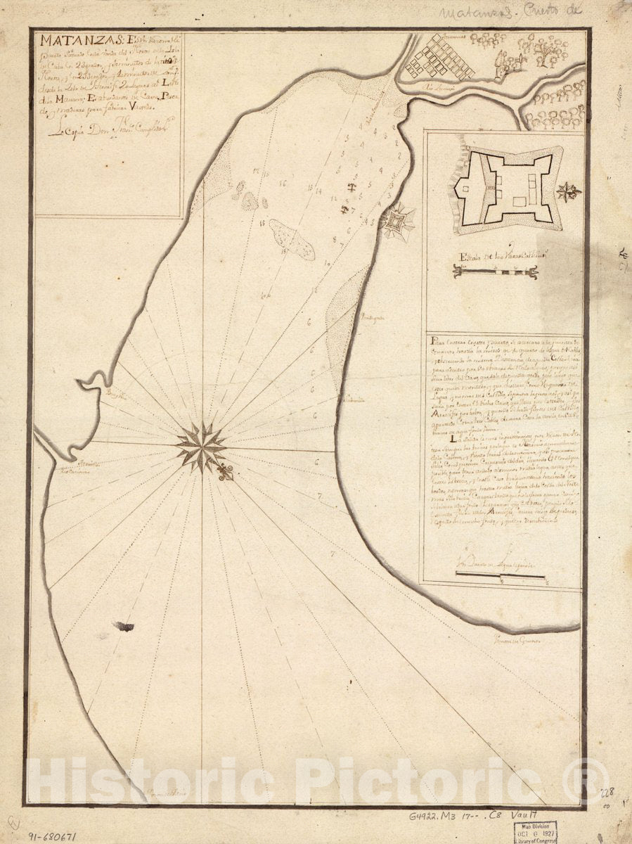 Historic 1700 Map - Matanzas Puerto situado en la Vanda del nortte de la Isla de Cuba en 23 grados y 10 minutos de latittd. d. nortte y en 293 grados y 40 minutos de congd.