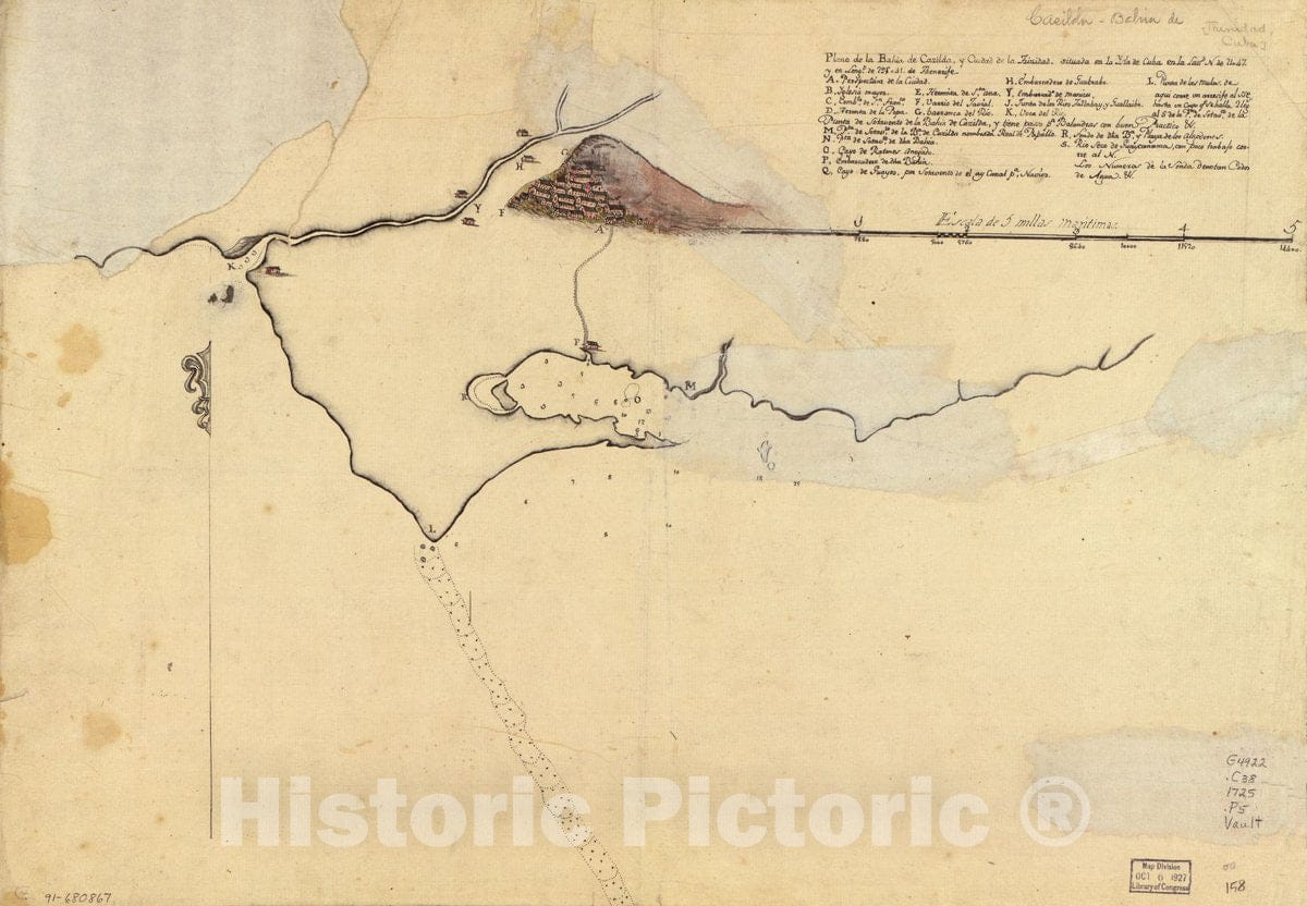 Historic 1725 Map - Plano de la Bahía de Cazilda y Ciudad de la Trinidad situada en la ysla de Cuba en la lattd. N. de 2147 y en longd. de 29541 de Thenerife.
