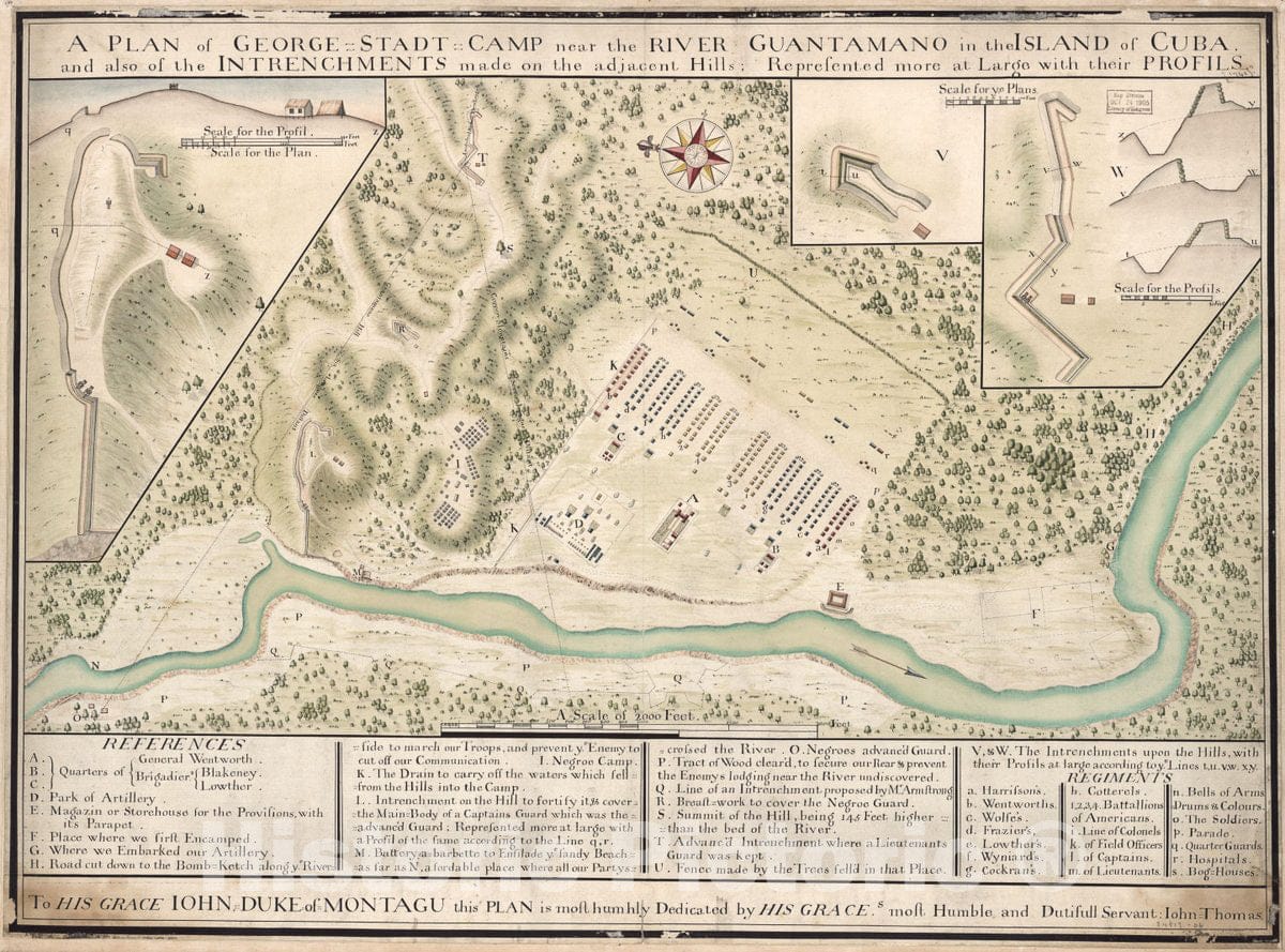 • Historic 1741 Map - A Plan of George Stadt Camp Near The River Guantamano in The Island of Cuba and Also of The intrenchments Made on The Adjacent Hills