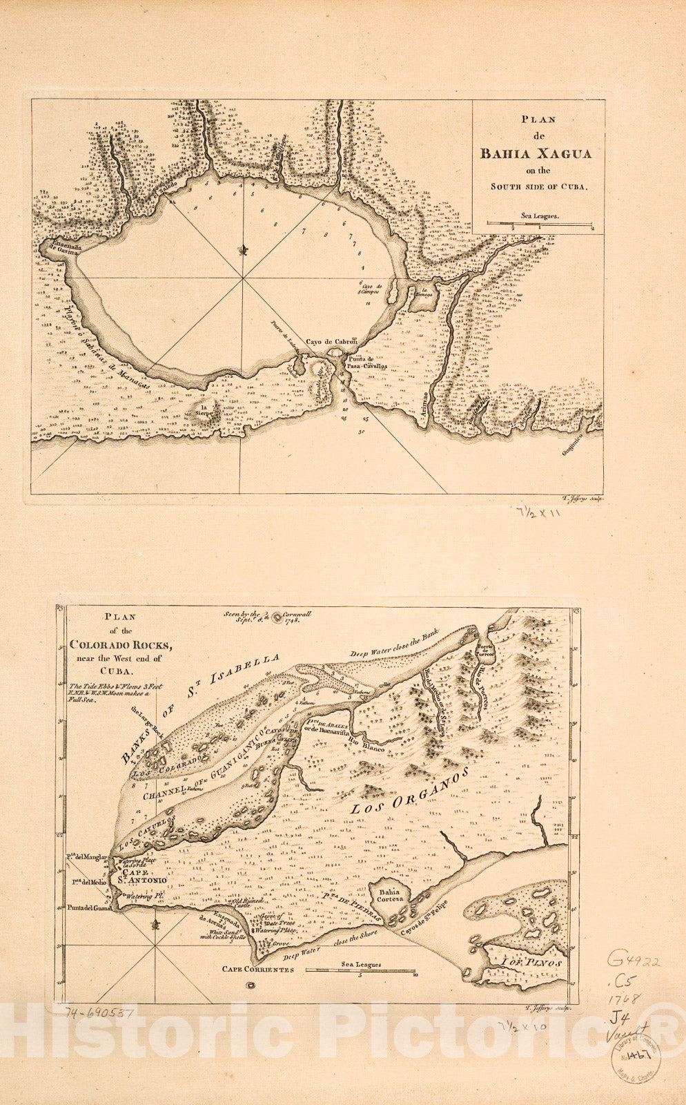 Historic 1768 Map - Plan de BahÃa Xagua on The South Side of Cuba; Plan of The Colorado Rocks, Near The west end of Cuba