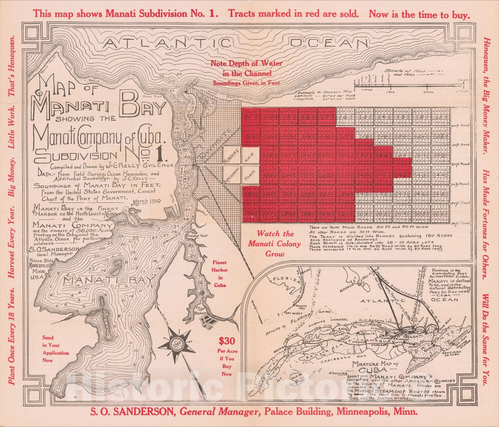 Historic Map : [American Colonies in Cuba] Map of Manati Bay Showing the Manati Company of Cuba. Subdivision No. 1., 1910, J.C. Kelly, Vintage Wall Art