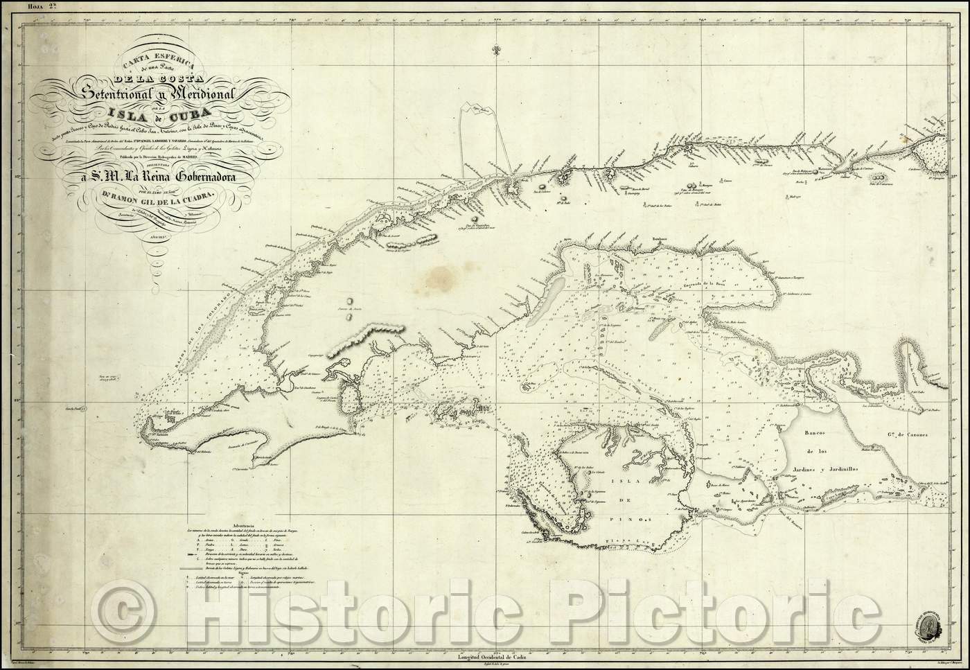 Historic Map - Carta Esferica De Una Parte de la Costa Setentrional y Meridional de la Isla de Cuba/Chart of Cuba from official Spanish sources, 1837 - Vintage Wall Art