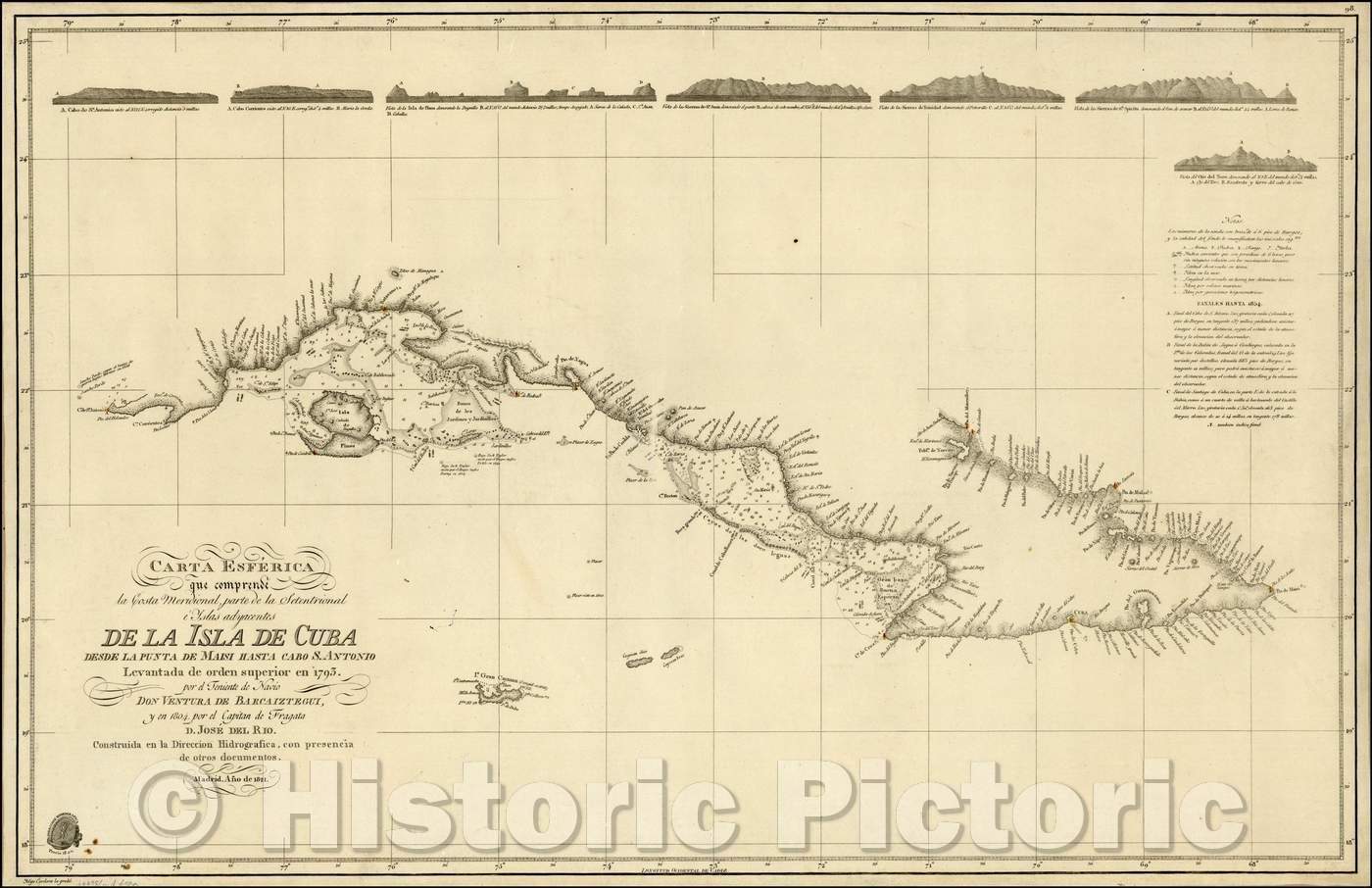 Historic Map - Carta Esferica que comprende la Costa Meridionale parte de la Setentrional/Spanish Chart of Cuba, including 7 profile Views, 1828 - Vintage Wall Art