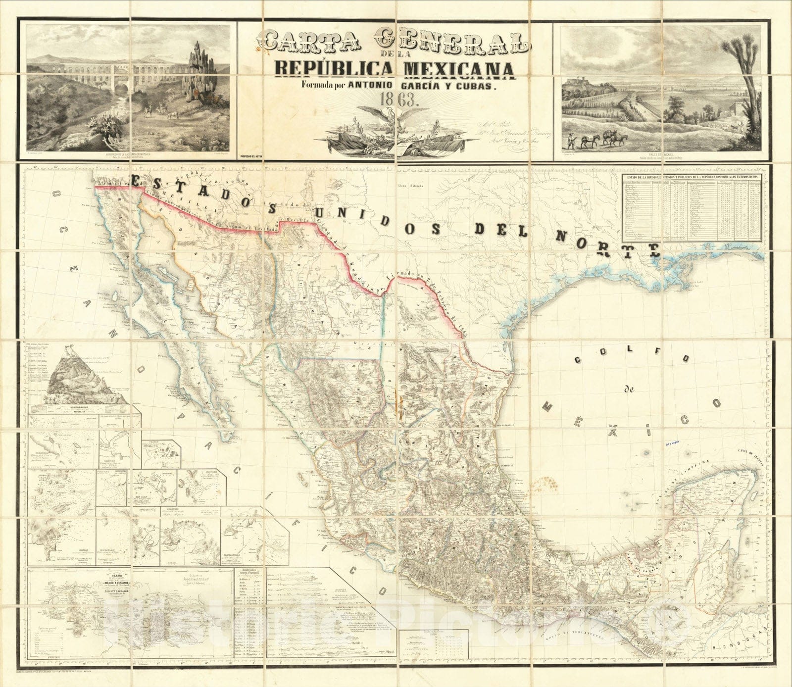 Historic Map : Carta General de la Republica Mexicana, formada por Antonio Garcia y Cubas. 1863, 1863, Antonio Garcia y Cubas, Vintage Wall Art