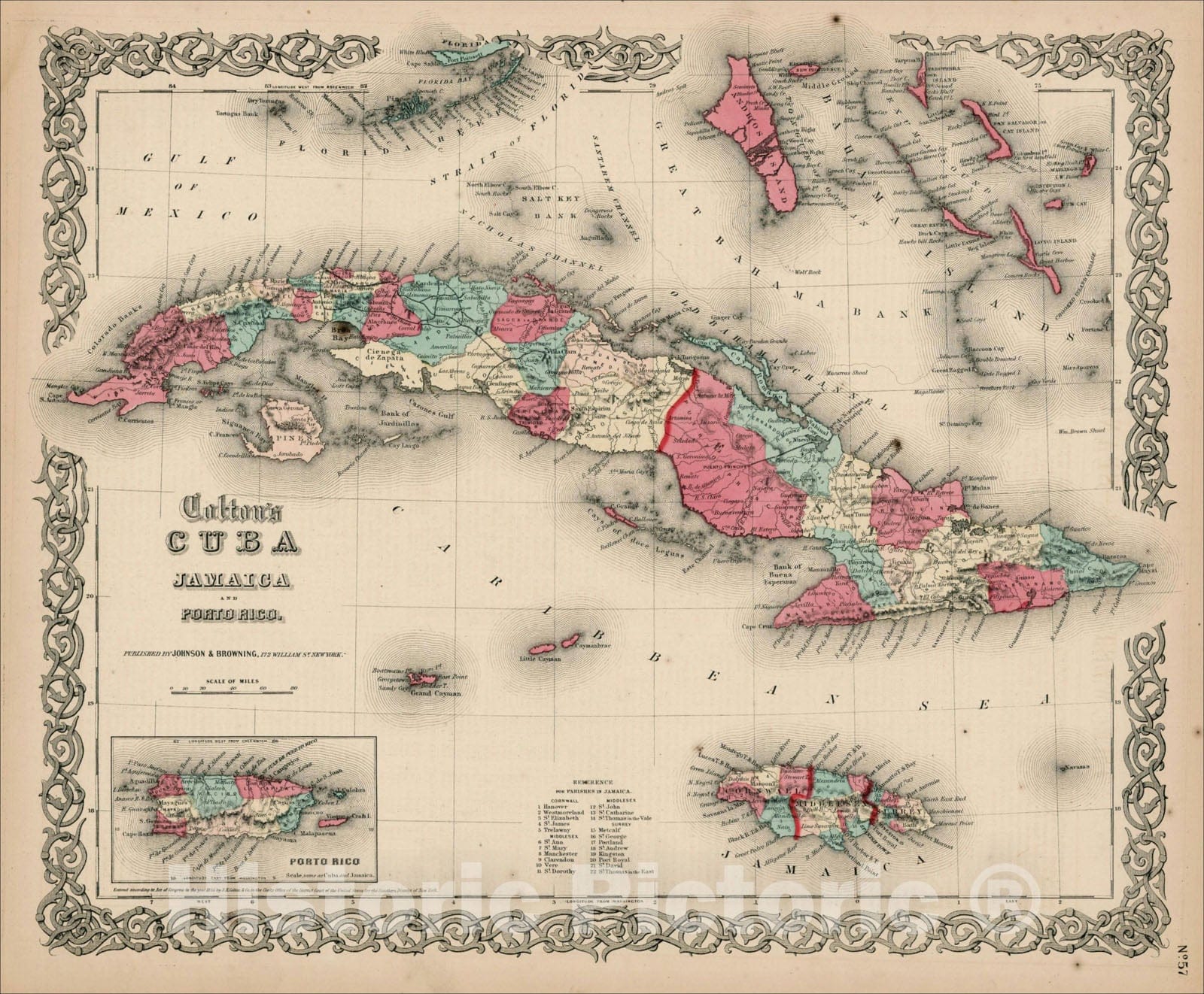 Historic Map : Colton's Cuba, Jamaica and Porto Rico, 1859, Joseph Hutchins Colton, Vintage Wall Art