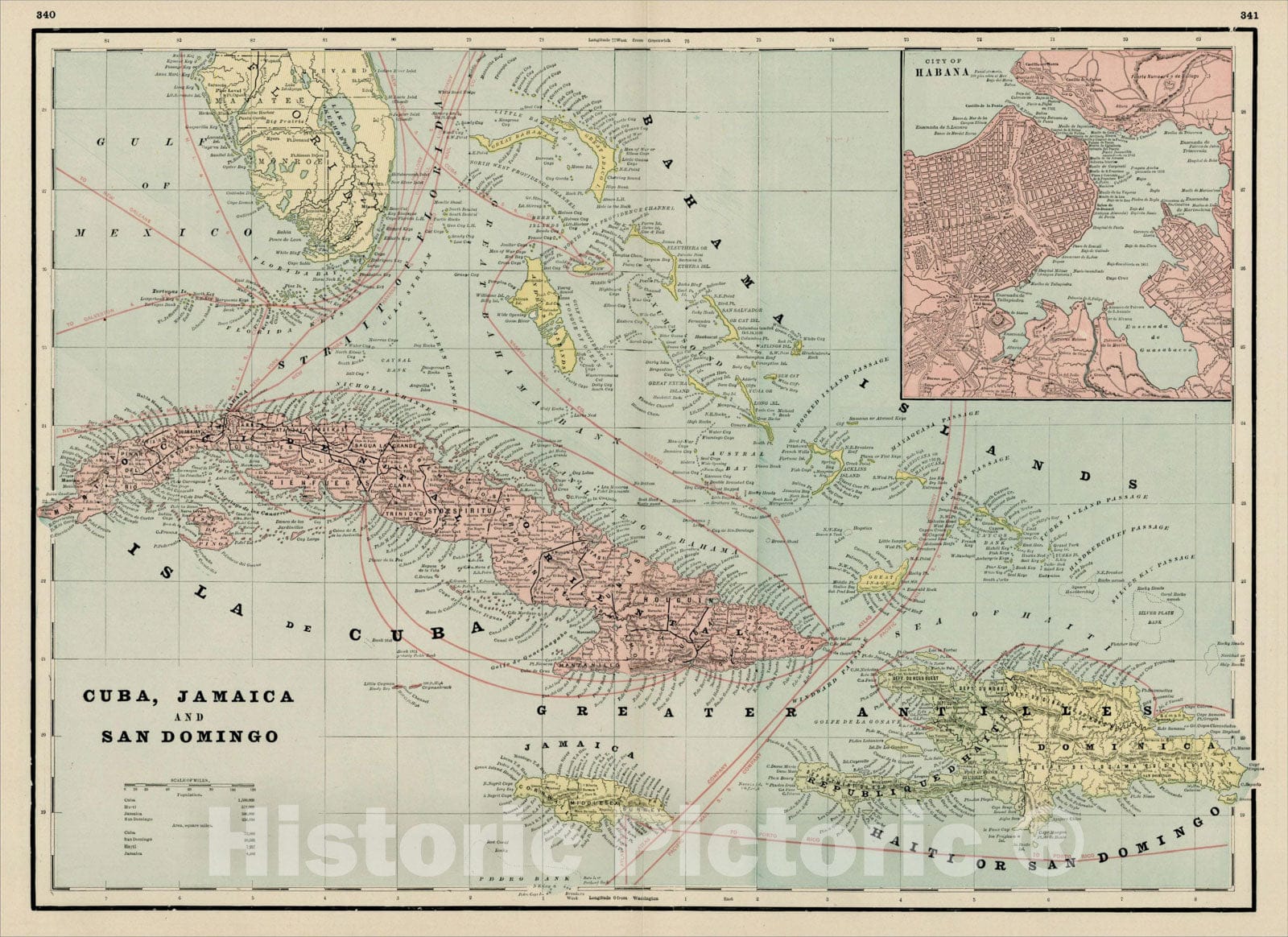 Historic Map : Cuba, Jamaica, and Santo Domingo, 1892, George F. Cram, Vintage Wall Art