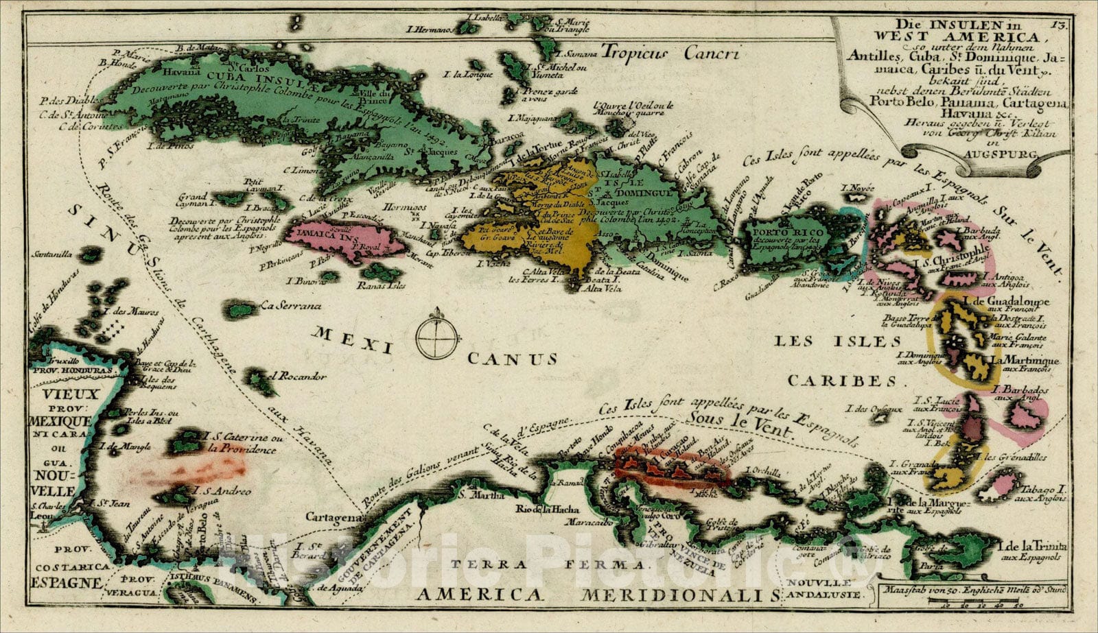 • .Historic Map : Die Insulen in West America so unter dem Nahmen Antilles, Cuba St, 1760, Christian Friedrich von der Heiden, Vintage Wall Art