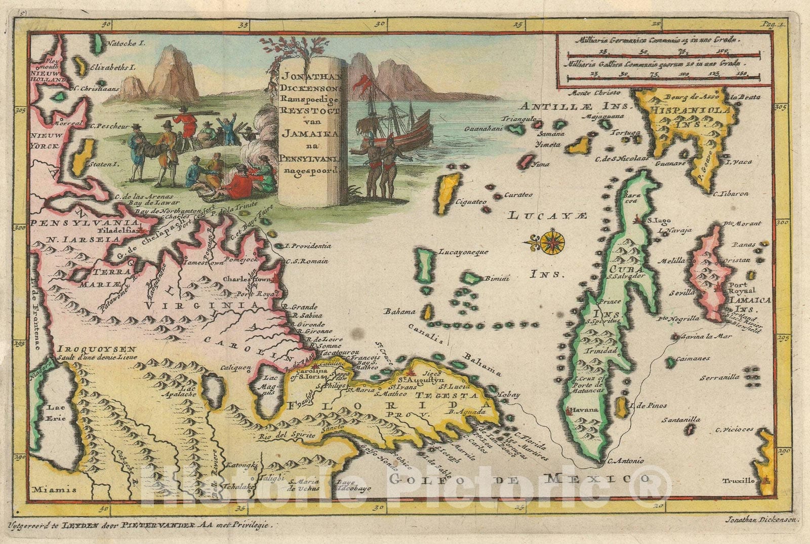 Historic Map : Florida, Carolina, Virginia and Cuba, Jonathan Dickinson, 1707, Vintage Wall Art