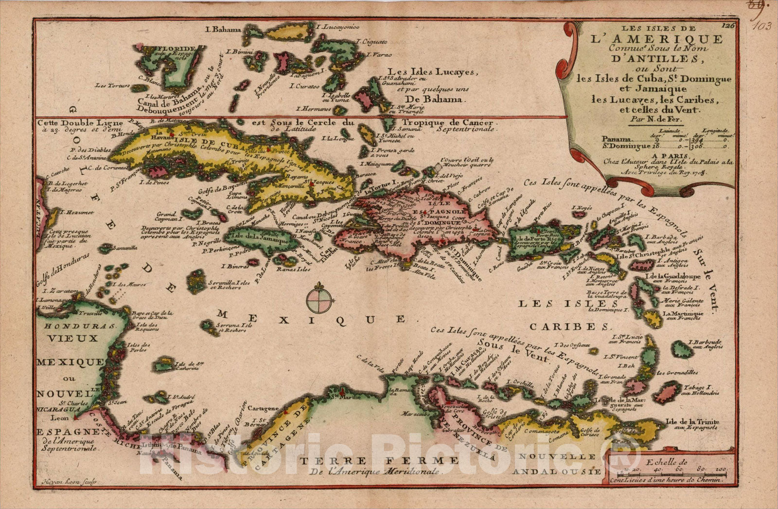 • .Historic Map : Les Isles De L'Amerique Connues Sous le Nom D'Antilles, ou Sont les Isles de Cuba, St. Domingue et Jamaique les Lucayes, les Caribes? 175, 1705, Vintage Wall Art