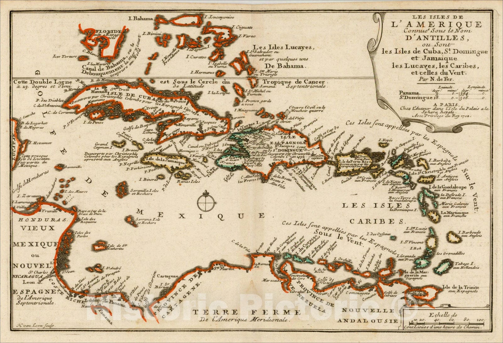 Historic Map : Les Isles De L'Amerique Connues Sous le Nom D'Antilles, ou Sont les Isles de Cuba, St. Domingue et Jamaique les Lucayes, les Caribes, 172, 1702, Vintage Wall Art