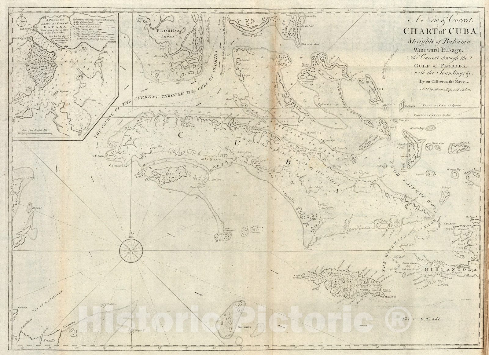 Historic Map : New & Correct Chart of Cuba, Streights of Bahama, Windward Passage, the Current through the Gulf of Florida., 1794, Vintage Wall Art