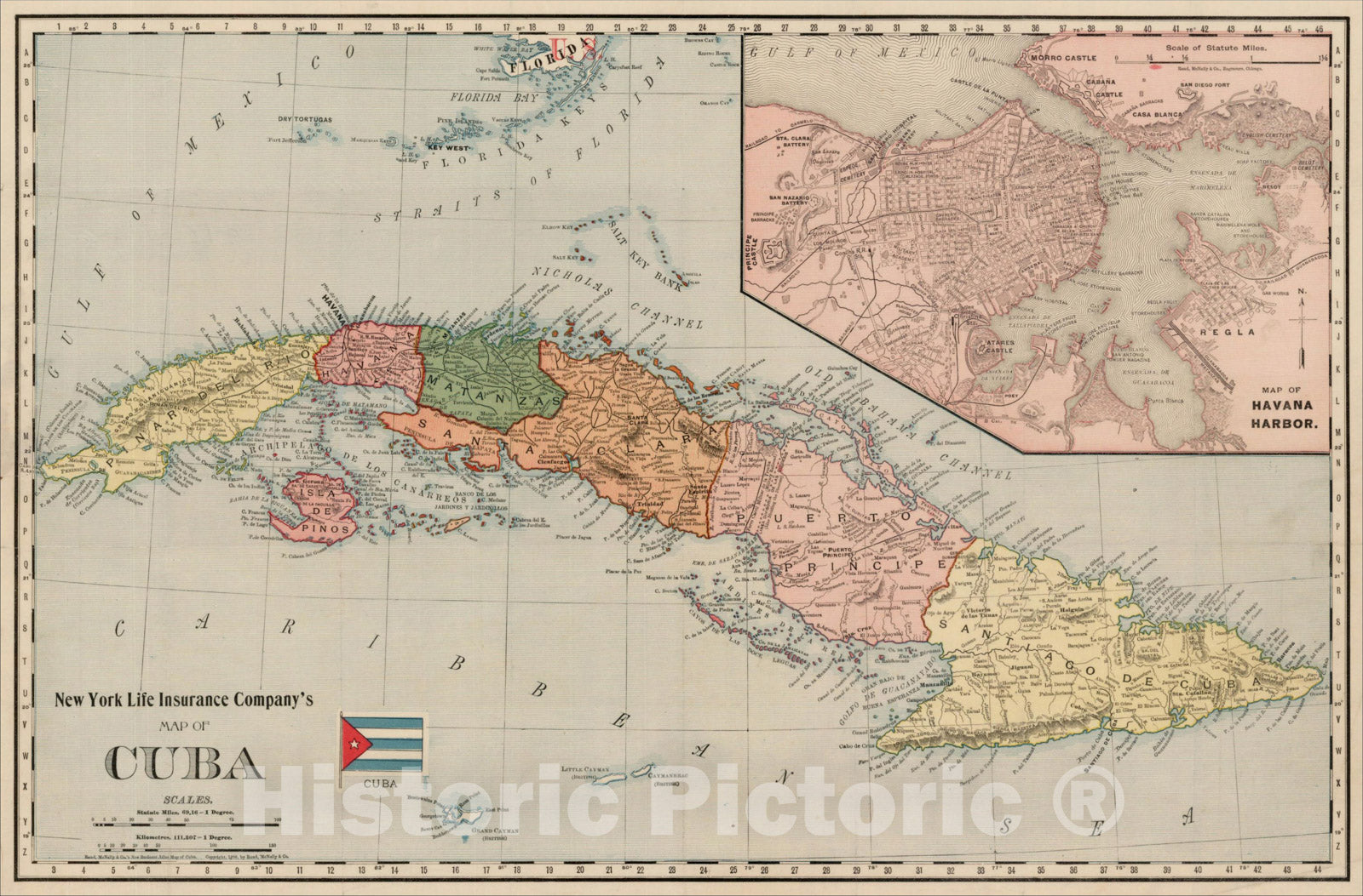 Historic Map : New York Life Insurance Company's Map of Cuba, 1898 (with Flag), 1898, , Vintage Wall Art