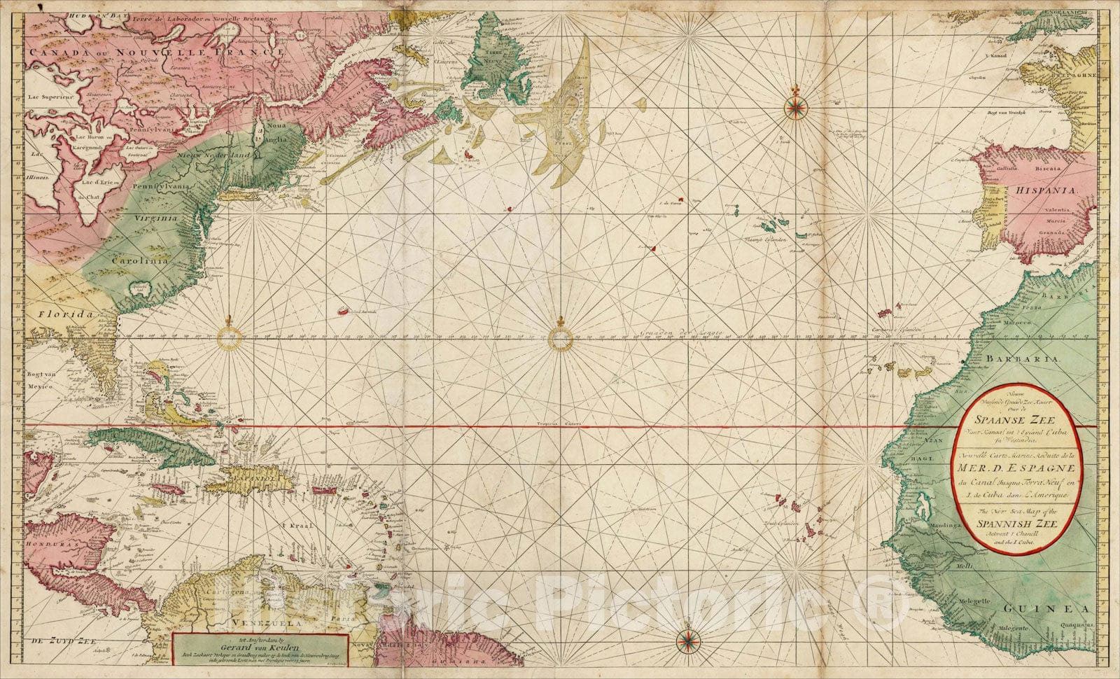 Historic Map : Nieuwe Wassende Graade Zee Kaart over de Spaanse Zee Vant Kanaal tot 't Eyland Cuba In Westindia, c1720, , Vintage Wall Art