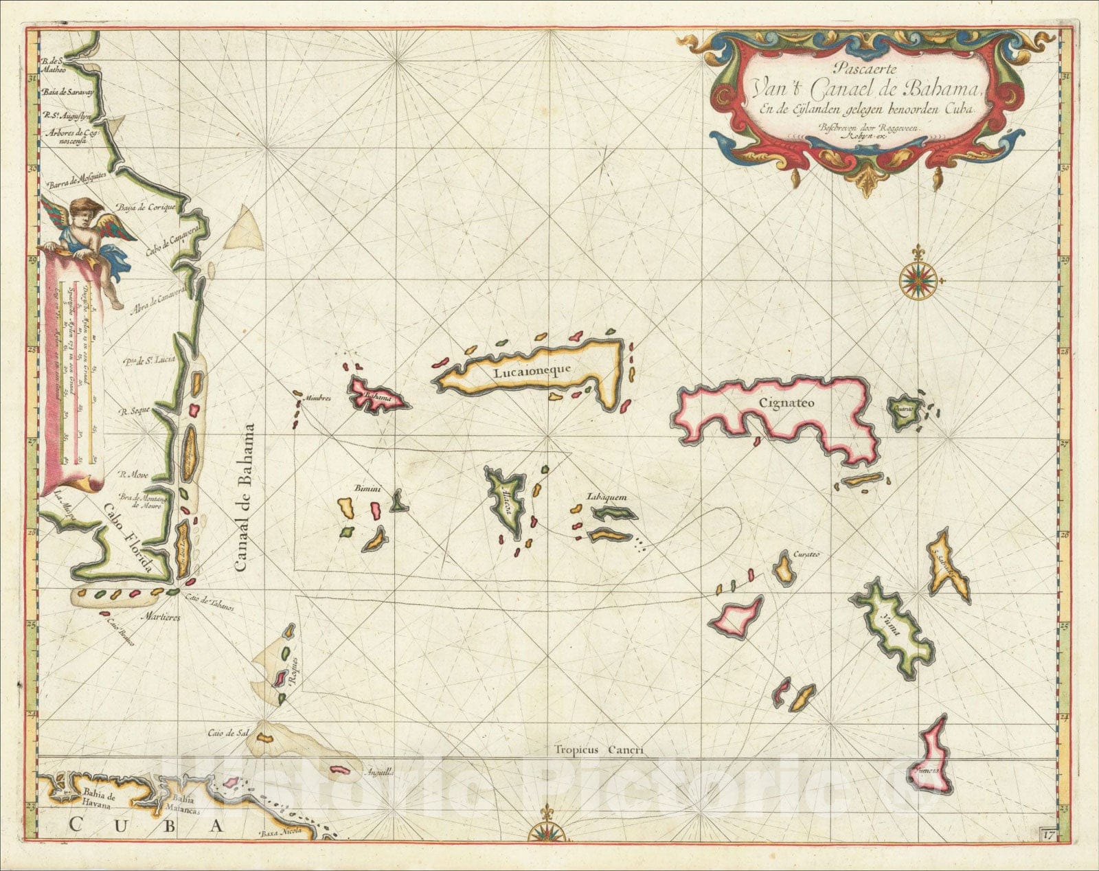 Historic Map : Pascaerte Van't Canael de Bahama, en de Eylanden gelegen benoorden Cuba. Beschreven door Roggeveen., 1678, Arent Roggeveen, v1, Vintage Wall Art