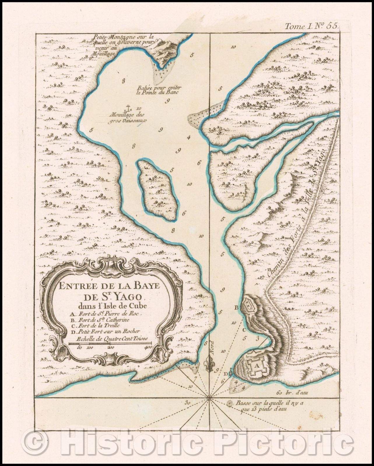 • .Historic Map - Santiago Bay, Cuba/Entree de La Baye de St. Yago dans l'Isle de Cube, 1764, Jacques Nicolas Bellin - Vintage Wall Art