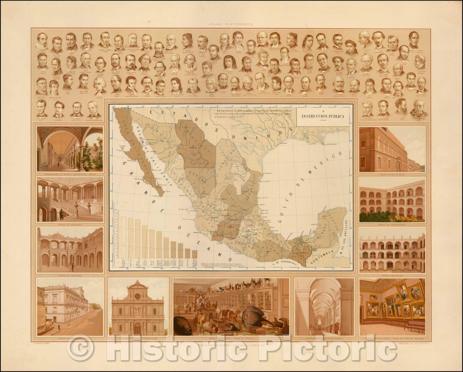 Historic Map - V Instruccion Publica/Map of Mexico, depicting famous Academics of Mexico etc, 1885, Antonio Garcia y Cubas - Vintage Wall Art