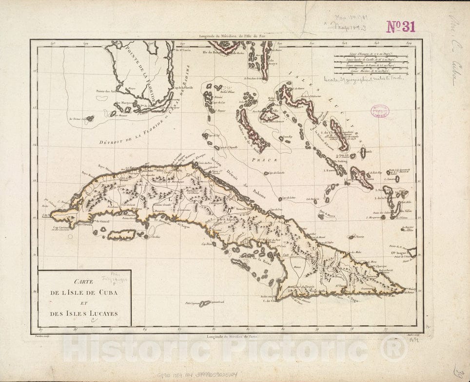 Historical Map, 1789 Carte de l'Isle de Cuba et des Isles Lucayes, Vintage Wall Art