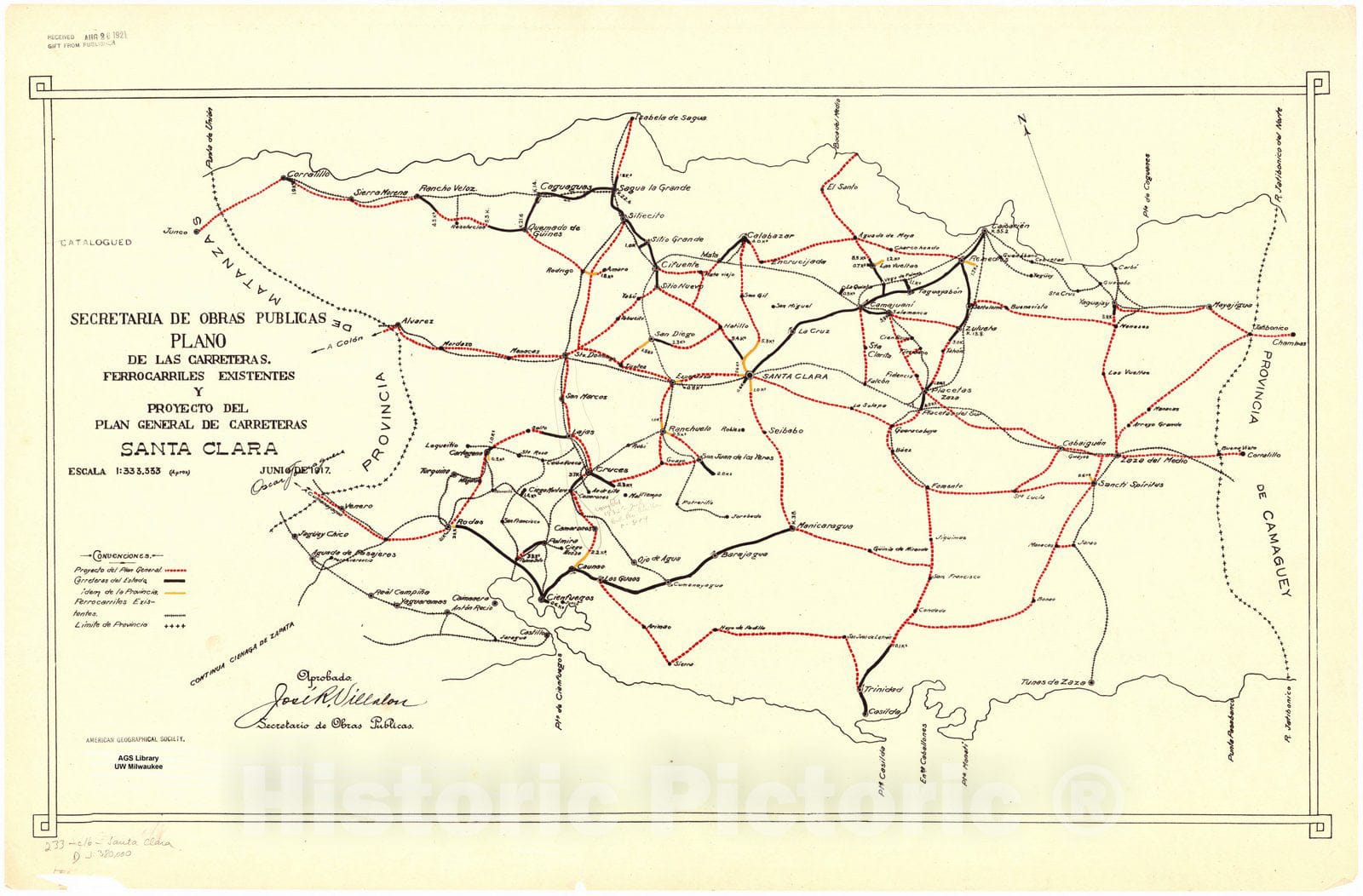 Plano de las carreteras, ferrocarriles existentes y proyecto del plan general de carreteras ... [de Cuba] / Secretaria de Obras Publicas ; Aprobado Jose R. Villalon, Secretario de Obras Pulibcas