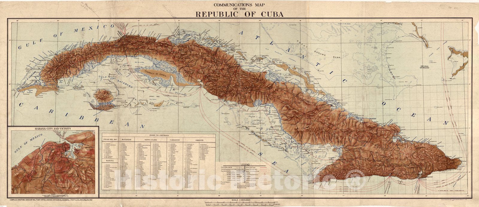 Map : Cuba 1924, Communications map of the Republic of Cuba, Antique Vintage Reproduction