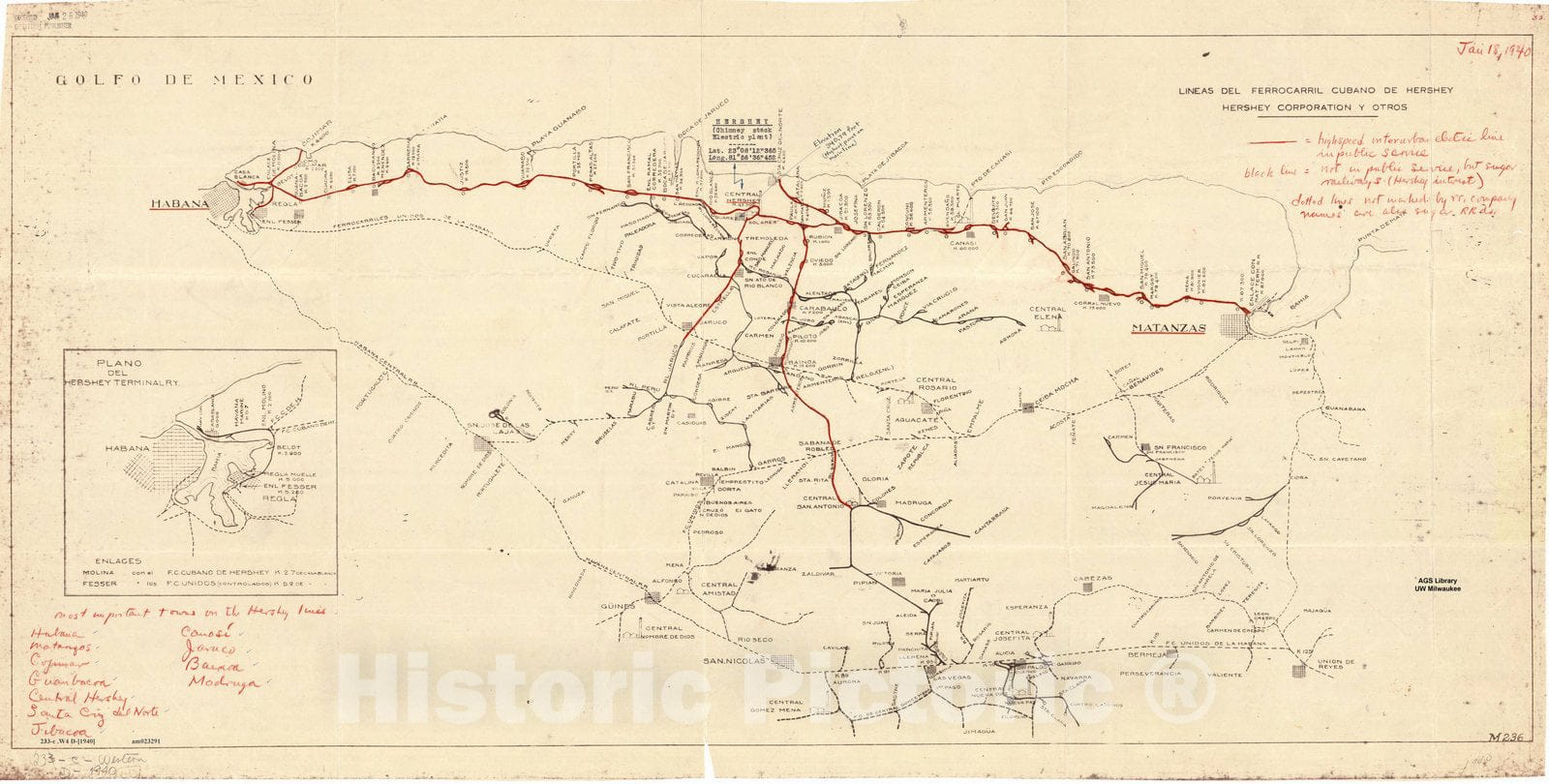 Map : Cuba 1940, Lineas del Ferrocarril Cubano de Hershey , Antique Vintage Reproduction