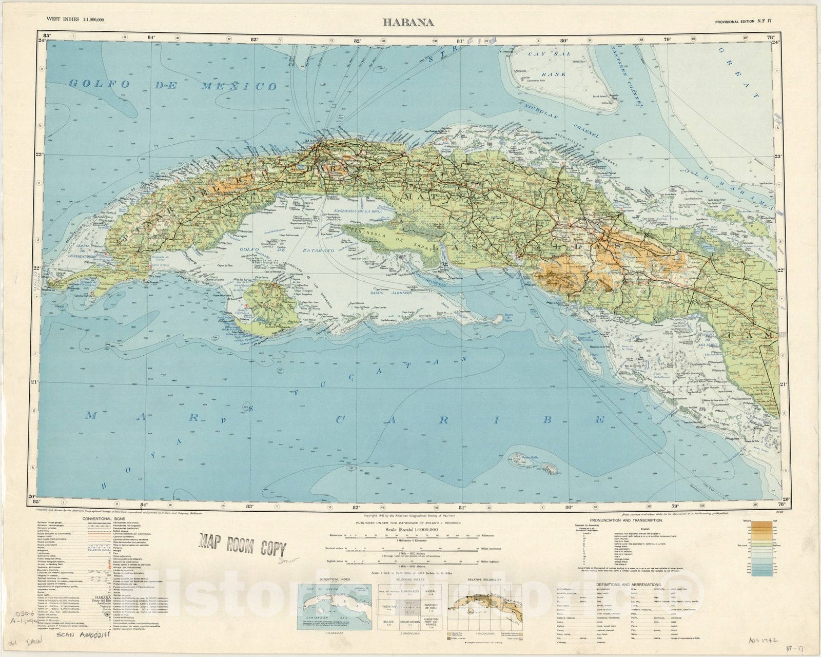 Map : Habana, Cuba 1942, Map of Hispanic America, Antique Vintage Reproduction