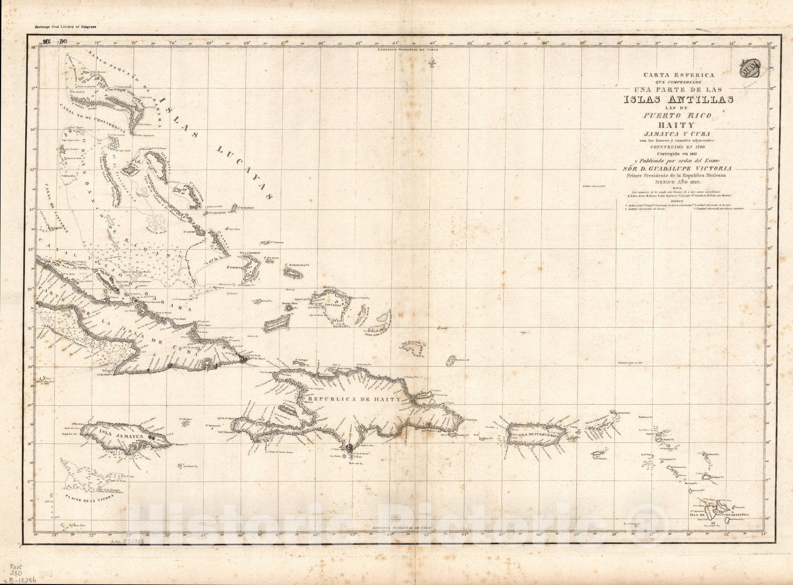 Carta esferica que comprehende una parte de las Islas Antillas, las de Puerto Rico, Haity, Jamayca y Cuba con los bancos y canales adyacentes / Construida en 1799, corregida en 1815 y publicada por orden del Escmo. Sor. D. Guadalupe Victoria, Primer Pr