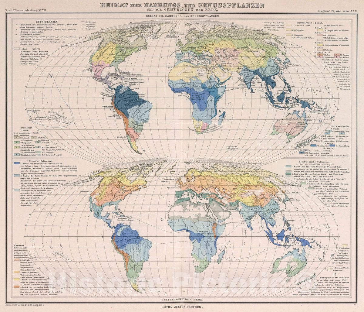 Historic Map : Heimat der Nahrungs und genusspflanzen und die culturezonen der Erde, 1887 Atlas - Vintage Wall Art
